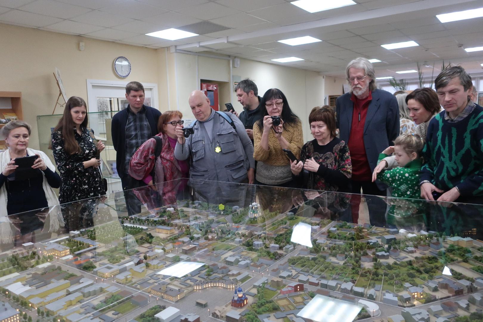 Наталья Юронен провела экскурсию по знаковым объектам города, расположенным на макете. Макет позволяет наглядно представить планировку города, которая сохранилась практически неизменно, включая размер и направление улиц. На нем воссоздан исторический центр Гатчины со старинными улицами. Границы макета проходят по проспекту от моста с кордегардиями и по современным улицам Радищева (бывшая Константиновская улица), Урицкого (Николаевская улица), Чкалова (Люцевская улица).