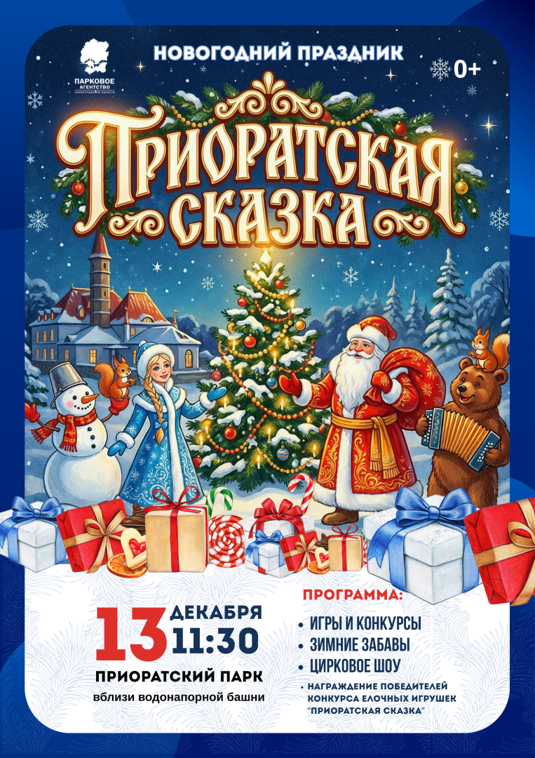 В программе праздника «Приоратская сказка»: интерактивная программа, зимние игры и забавы, можно будет сфотографироваться с ростовыми фигурами и поиграть в снежки со Снеговиком, увидеть дрессированных животных и, конечно, загадать самое заветное желание.